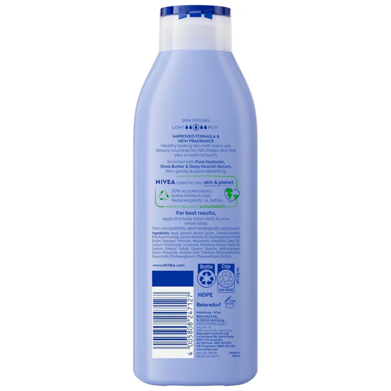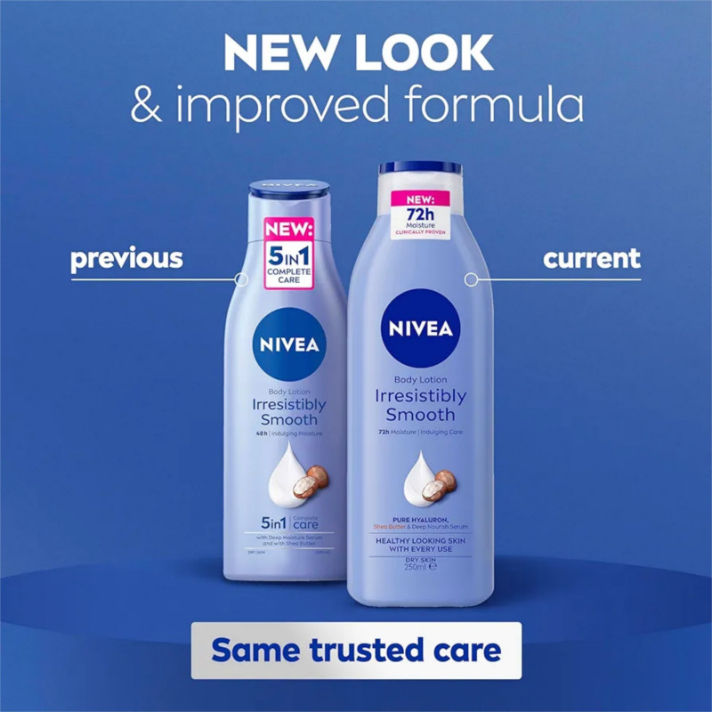 The Nivea Irresistibly Smooth Indulging Care Body Lotion 250ml is a rich, creamy moisturizer specifically formulated for dry to very dry skin, providing intensive and long-lasting hydration. The formula has been improved to offer clinically proven 72-hour moisture, according to Nivea, or 48 hours according to other sources, ensuring prolonged softness. Key ingredients include the Nivea Deep Nourish Serum, naturally derived Shea Butter, and in newer formulations, Pure Hyaluron (hyaluronic acid), which work to protect the skin and bind water within its deeper layers, preventing moisture loss. The lotion features a non-greasy, fast-absorbing formula that melts gently into the skin, leaving it noticeably smooth and supple to the touch after just one application. Users consistently praise its ability to make skin very soft with no oily or tacky residue, making it ideal for daily use, even in dry climates or during winter months. It has a light, pleasant, subtle fragrance, is dermatologically approved, and aims to give skin a healthy, glowing appearance. The bottle is made from 50% recycled plastic (excluding the cap), reflecting an effort toward sustainability.