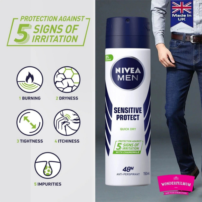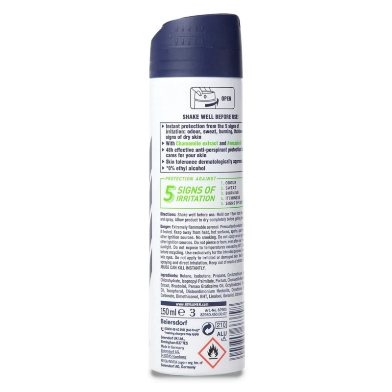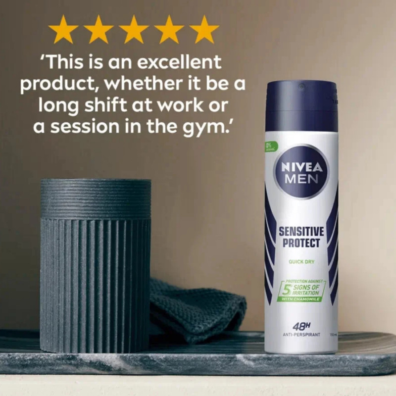 Nivea Sensitive Protect Quick Dry Anti-Perspirant Deodorant Body Spray 150ml offers effective sweat and odor protection while being gentle on sensitive skin. Its advanced formula provides up to 48 hours of reliable anti-perspirant protection, keeping underarms fresh and dry throughout the day. The quick-dry technology ensures the spray absorbs instantly without leaving sticky or greasy residue. Infused with soothing ingredients, it helps calm and protect sensitive underarm skin. The subtle, fresh fragrance provides long-lasting freshness without irritation. Dermatologically tested for skin compatibility and suitable for daily use. Lightweight and non-sticky, it allows for comfortable all-day wear. Ideal for work, travel, workouts, or active lifestyles. The convenient spray format ensures even coverage and easy application. Helps maintain softness and smoothness of underarm skin. Prevents odor and wetness while caring for delicate skin. Compact and travel-friendly, perfect for on-the-go touch-ups. Provides confidence in all situations with gentle yet effective protection. Nivea Sensitive Protect Quick Dry Anti-Perspirant Body Spray 150ml combines care, comfort, and long-lasting freshness for sensitive skin.