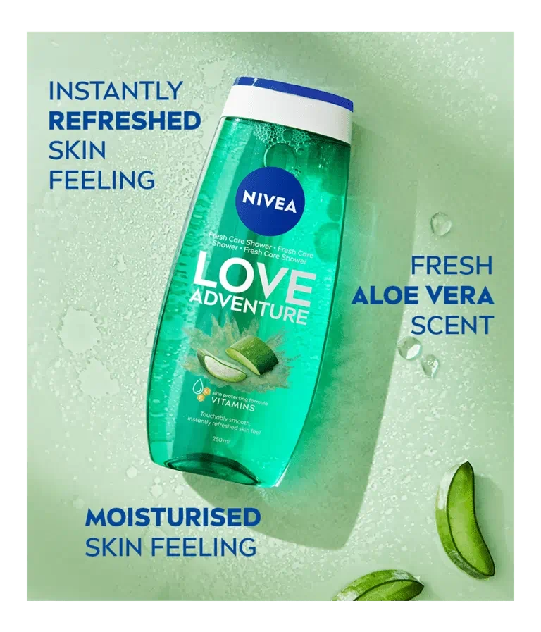 NIVEA LOVE Adventure refreshing shower gel instantly refreshes and cares for your skin. Formulated with vitamin C and E, this shower gel gently cleanses, leaving the skin feeling clean and healthy. NIVEA’S everyday body wash boasts a natural aloe vera scent and turns your everyday shower into refreshing bliss. It is dermatologically approved and protects the skin from drying out, leaving it feeling touchably smooth. Free from microplastics, this shower gel is pH skin neutral, has a 99% biodegradable formula, is a 100% climate-neutralised product, and comes in a bottle made from 96% recycled plastic*. With more than 130 years of experience, NIVEA is a market leader in the global skincare industry. Our researchers work extensively to provide high-quality, dermatologically approved products to suit various skin types and all your skin needs: NIVEA LOVE Adventure Shower Gel. *excluding cap & label