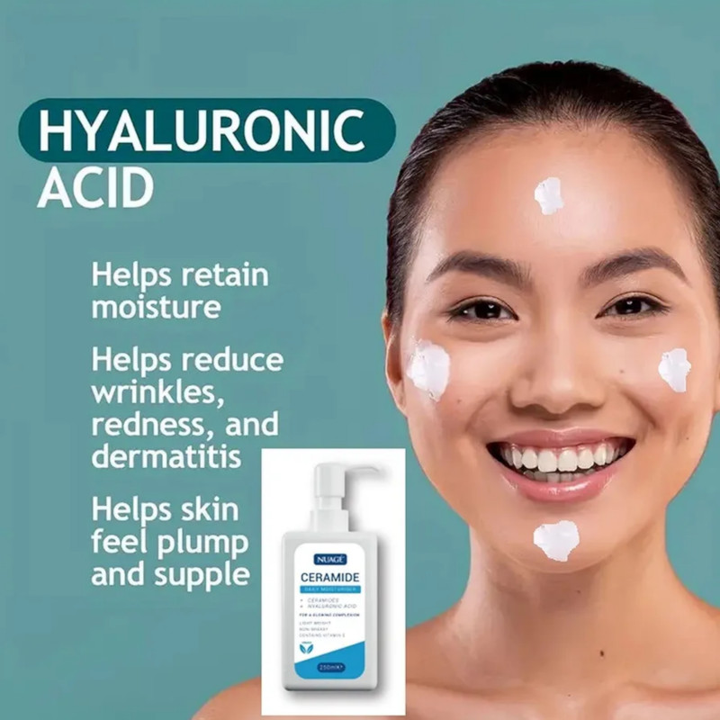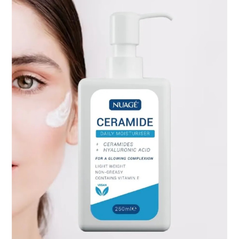 The Nuage Light Weight & Non-Greasy Ceramide Daily Moisturiser 250ml is a versatile, fast-absorbing, and nourishing formula designed to hydrate and protect both the face and body. This daily moisturizer is enriched with a powerful blend of essential skincare ingredients, including three potent ceramides (Ceramide NP, Ceramide AP, and Ceramide EOP), hyaluronic acid, and vitamin E, that work synergistically to support and renew the skin's natural protective barrier. Its key benefits include deep, long-lasting hydration by attracting and retaining moisture within the skin layers, which helps alleviate dryness and discomfort. The lightweight, non-greasy texture ensures quick absorption without leaving any heavy or sticky residue, making it suitable for all skin types, including sensitive and acne-prone skin, and it can be used comfortably under makeup. The formula also provides antioxidant benefits from the inclusion of Vitamin E and helps improve skin elasticity to diminish the appearance of fine lines and wrinkles, promoting a healthy-looking, supple, and radiant complexion. Additionally, it is a vegan-friendly and fragrance-free product, appealing to those with specific preferences or sensitivities. The cream is packaged in a convenient 250ml pump dispenser bottle for easy and hygienic daily application.