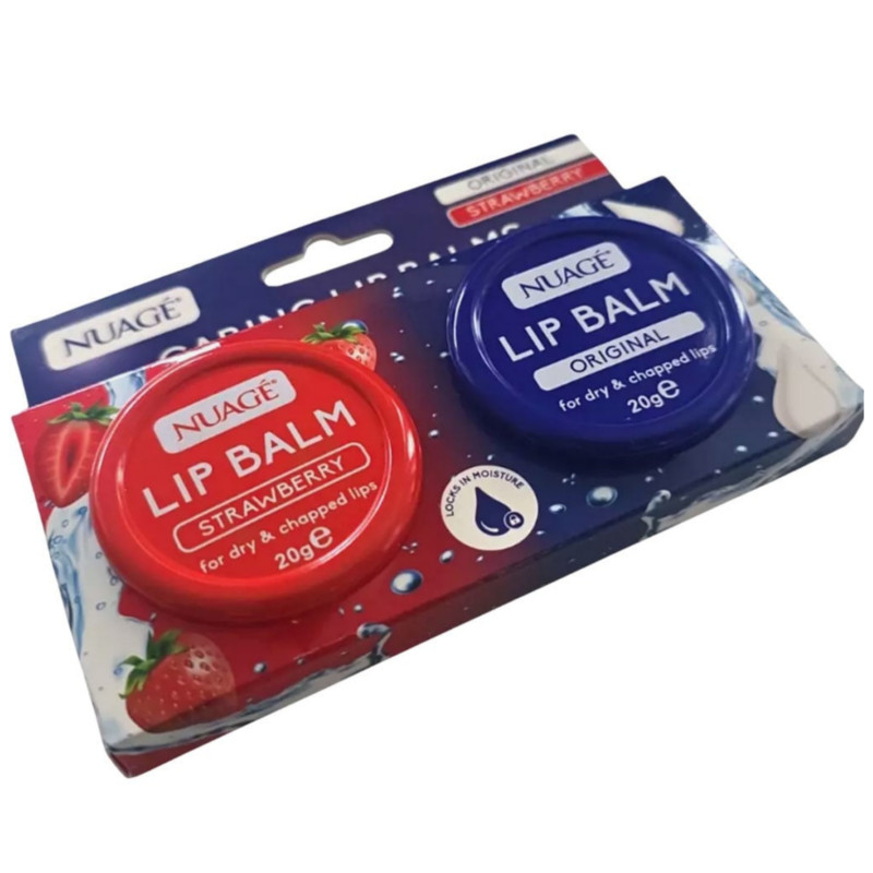 Nuage Original and Strawberry Caring Lip Balms for Dry and Chapped Lips 20 g – (2 Pack) delivers rich, soothing hydration and effective care with dual balms ideal for everyday use at home or on the go, combining deep moisturisation with a sweet strawberry twist; enriched with nourishing ingredients like natural botanical extracts and conditioning butters, they help lock in moisture to repair and prevent dryness, leaving lips feeling soft, smooth, and comfortably hydrated. The creamy texture glides on effortlessly for even coverage and forms a protective barrier against wind, cold, and environmental stressors that can cause cracking and flaking. The original balm offers classic soothing care while the strawberry variant adds a refreshing fruity scent that makes each application enjoyable. Designed for all skin types, including sensitive lips, they provide gentle but effective lip nourishment without irritation. Compact and portable, each balm fits easily into purses, pockets, or backpacks for on-the-go hydration whenever needed. Daily use helps maintain healthy moisture balance and prevent soreness or tightness. Great for use under lipstick to enhance smoothness and prolong wear. The generous 20 g size across two balms delivers excellent value and long-lasting care. Dermatologically tested for skin friendliness and dependable performance. Helps keep lips soft and supple through changing weather conditions and outdoor activities. A versatile lip care essential that combines deep moisturisation with protective comfort. Nuage Original and Strawberry Caring Lip Balms keep lips beautifully conditioned, refreshed, and hydrated with every use.