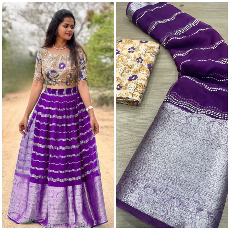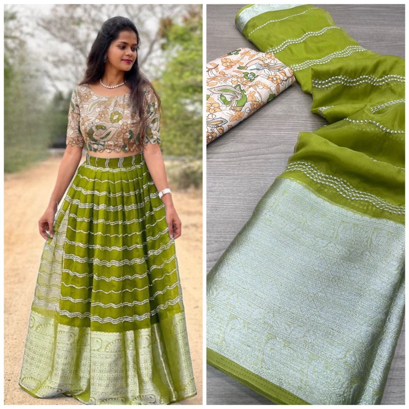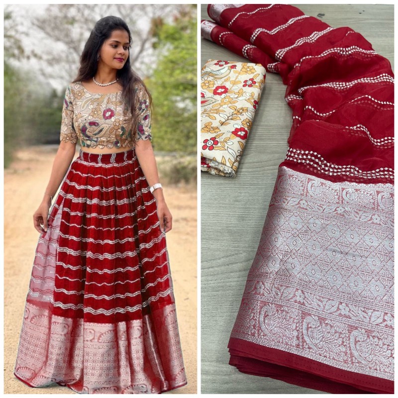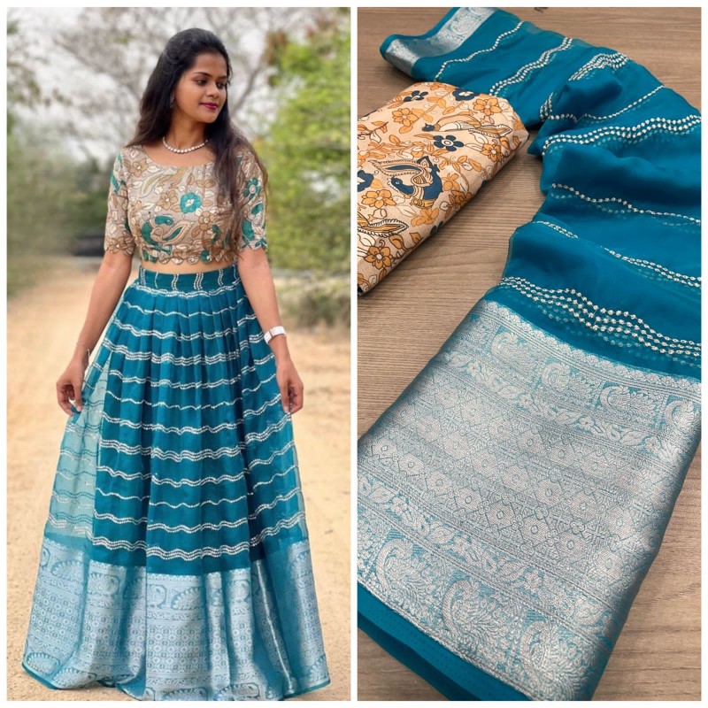 Frock Style Lahenga RIVAAJ Fabric Nylon Orgenza Jacquard Multi Emrodiry Work Lengha & Digital Printed Blouse Lengha :- 3 Meter Fabric Blouse :- 0.80 Cm