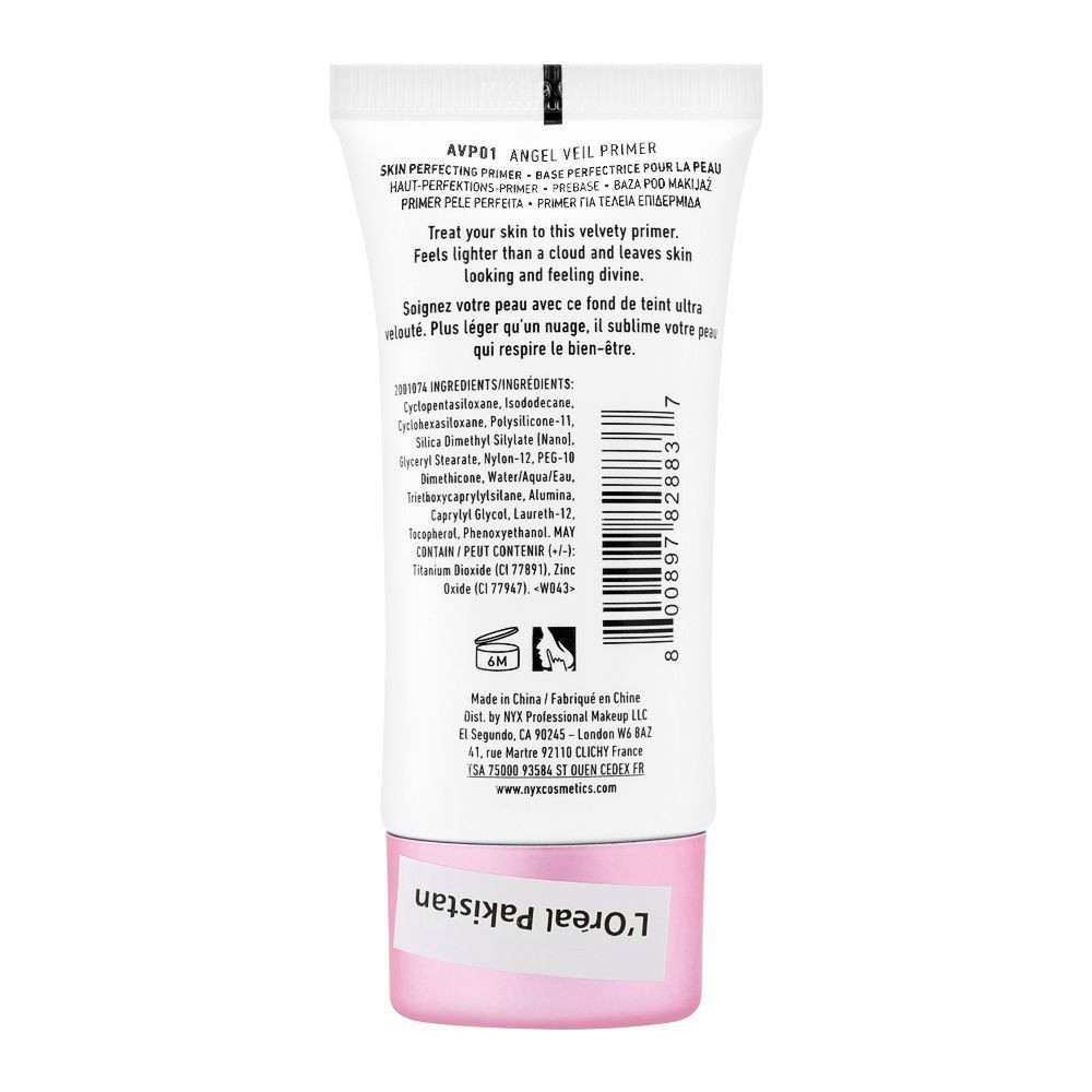 NYX Professional Makeup Angel Veil Skin Perfecting Primer 30ml is a silky, lightweight face primer designed to create a smooth and flawless base for makeup application. Its ultra-smooth formula glides easily onto the skin, forming a soft, satin-finish veil that helps prepare the complexion for foundation. The primer helps minimise the appearance of pores, fine lines, and uneven skin texture, giving the skin a refined and perfected look. Its lightweight consistency feels comfortable and breathable on the skin without leaving a heavy or greasy residue. The oil-free formula helps control excess shine while maintaining a smooth and balanced complexion. Designed to improve makeup longevity, it allows foundation and other face products to apply evenly and last longer throughout the day. The velvety texture creates a cushion-like layer that enhances makeup blending for a professional finish. Suitable for all skin types including normal, combination, and oily skin. The primer can be worn alone to smooth the skin or used under makeup for a flawless base. Its satin finish helps create a soft-focus effect that blurs imperfections and refines the skin’s appearance. The formula spreads easily, so only a small amount is needed for full-face coverage. The convenient squeeze tube packaging makes it easy to use and perfect for travel or daily routines. The vegan formula is also cruelty-free and free from alcohol and fragrance. Ideal for anyone looking to achieve a smoother, more polished complexion before applying makeup. NYX Angel Veil Skin Perfecting Primer 30ml delivers pore-blurring smoothness, shine control, and a long-lasting makeup base in one essential product. ✨