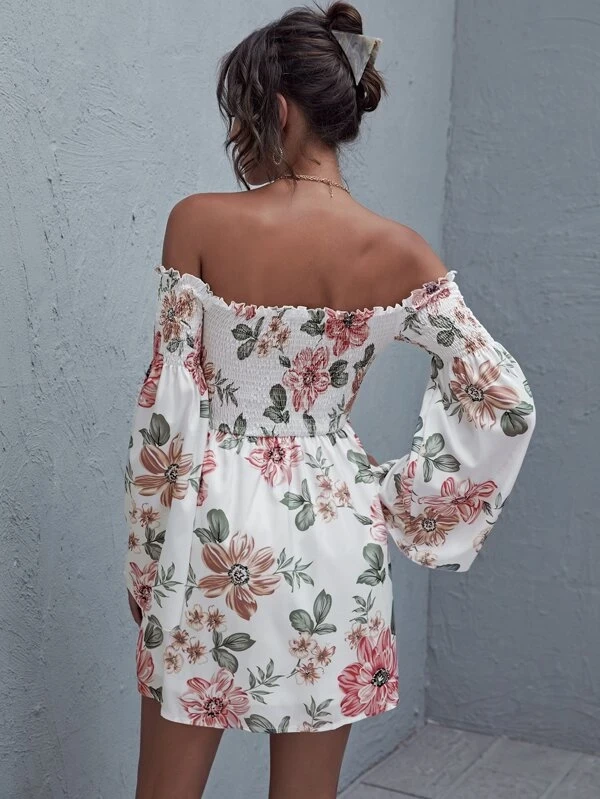 Off Shoulder Frill Trim Shirred Floral Dress