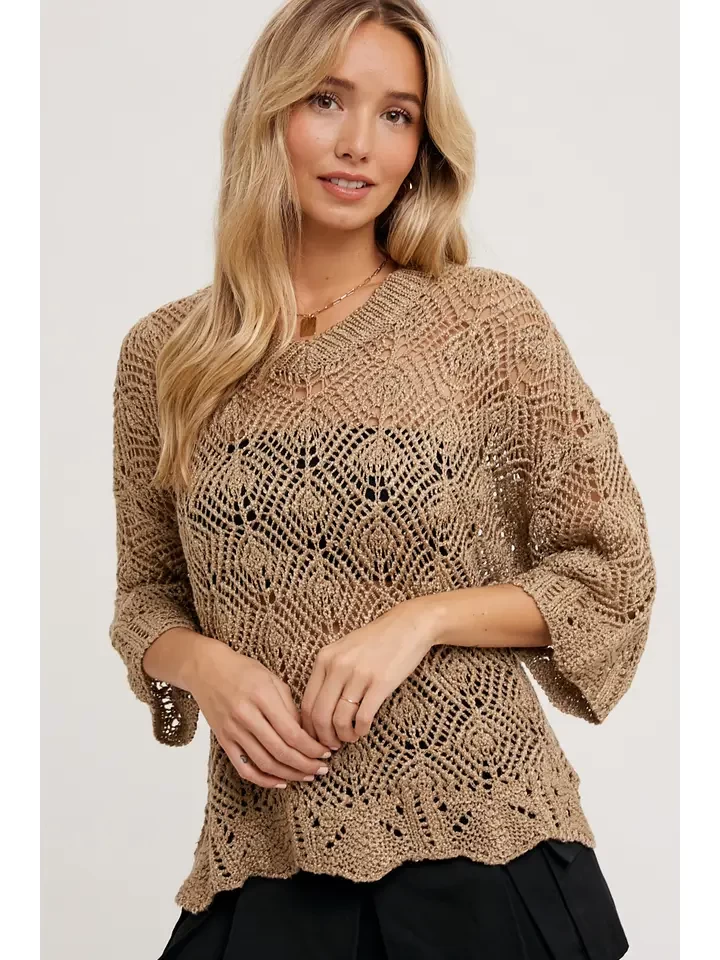 The open-knit 3/4 sleeved pullover is a stylish and versatile piece that offers a blend of elegance and comfort. With its open-knit design, it provides a breathable and airy feel. The 3/4 length sleeves offer a balance between coverage and a relaxed fit. Ideal for layering or as a standalone piece, this pullover brings a touch of sophistication to any outfit.