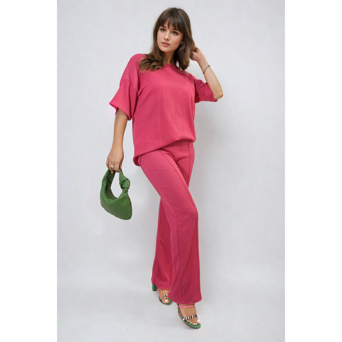 Introducing the Ashlyn Cheesecloth Pattern Top and Trouser Co-ord Set! This effortlessly chic set is perfect for those who appreciate comfort without compromising on style.