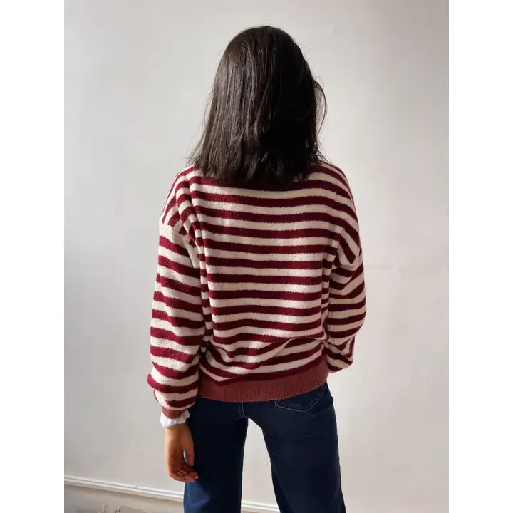 Long-sleeve sweater with burgundy and beige stripes The model is 164 cm tall and wears size S Designed in Barcelona and made in Europe Composition: 60% polyacrylic 14% polyamide 10% polyester 8% viscose 8% wool