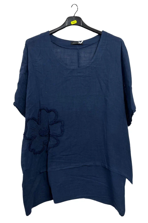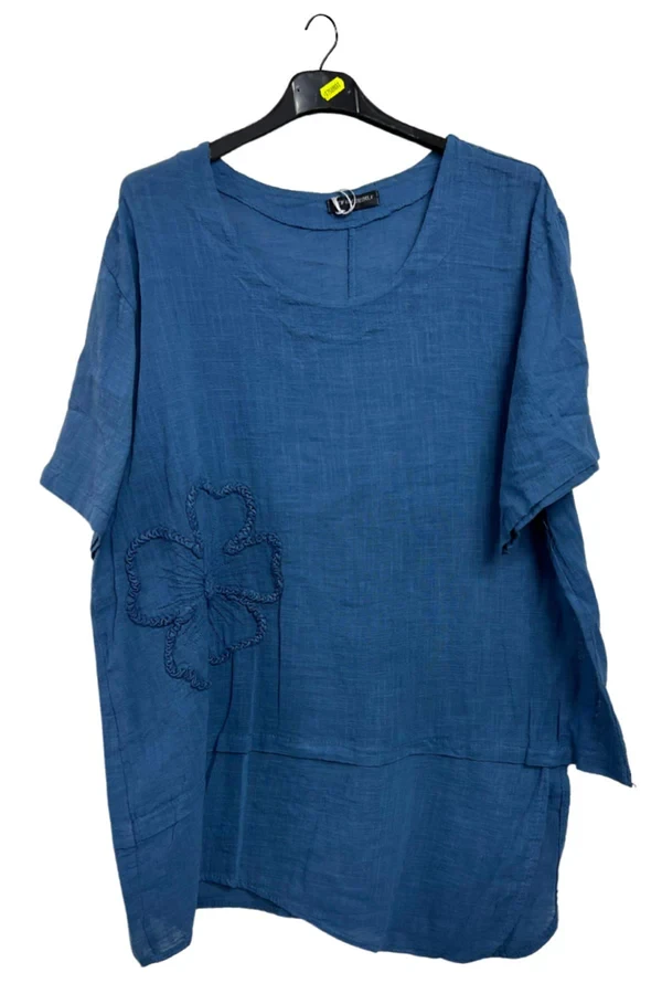 Step into effortless boho-chic with this Italian cotton top, designed in a plus-size loose fit for airy comfort and casual elegance. Crafted from breathable, crinkled texture fabric, this top embodies a relaxed spring-summer vibe while adding dimension to your outfit. The plain background is subtly elevated by delicate floral applique embroidery and a standout embroidered motif on the lower left side, bringing artisanal charm to everyday wear. The round neckline and short sleeves offer classic coverage, while the asymmetrical hemline with visible panep stitching creates a modern, flowy silhouette. Whether you're wandering through weekend markets or lounging under the sun, this top offers both comfort and style. Pair it with cropped trousers or flowy skirts to embrace its carefree aesthetic. With Italian craftsmanship at its core, this versatile piece turns simplicity into an expressive statement, blending nature-inspired details with timeless comfort for the ultimate in seasonal fashion.