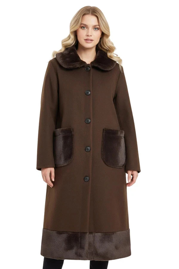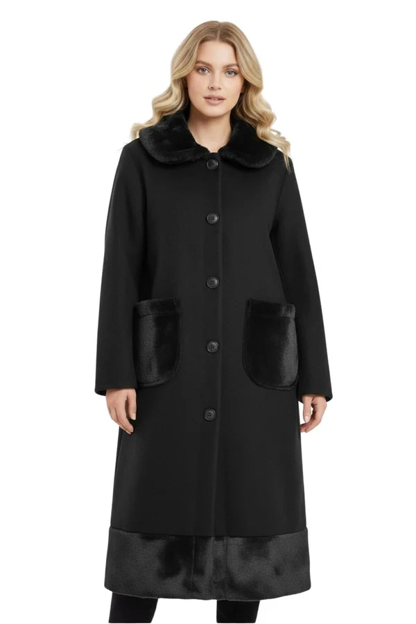 Wrap yourself in effortless sophistication with this Italian-inspired longline winter coat for women. Crafted from a soft wool-blend fabric, it’s designed for ultimate warmth and everyday luxury. The wide faux fur collar adds an elegant touch, while black button fastening at the front gives it a classic and refined appeal. Two front patch pockets trimmed with faux fur blend function with fashion, offering both style and comfort for chilly days. The straight hemline with fur trim completes the coat graceful silhouette, ensuring you look polished wherever you go. Perfect for autumn and winter layering, this polyester coat offers a relaxed, plus-size fit that allows easy movement and cozy comfort. Whether you heading out for a casual stroll, an evening outing, or winter travel, this loose-fit coat keeps you snug and stylish all season long — your perfect blend of warmth and timeless elegance.