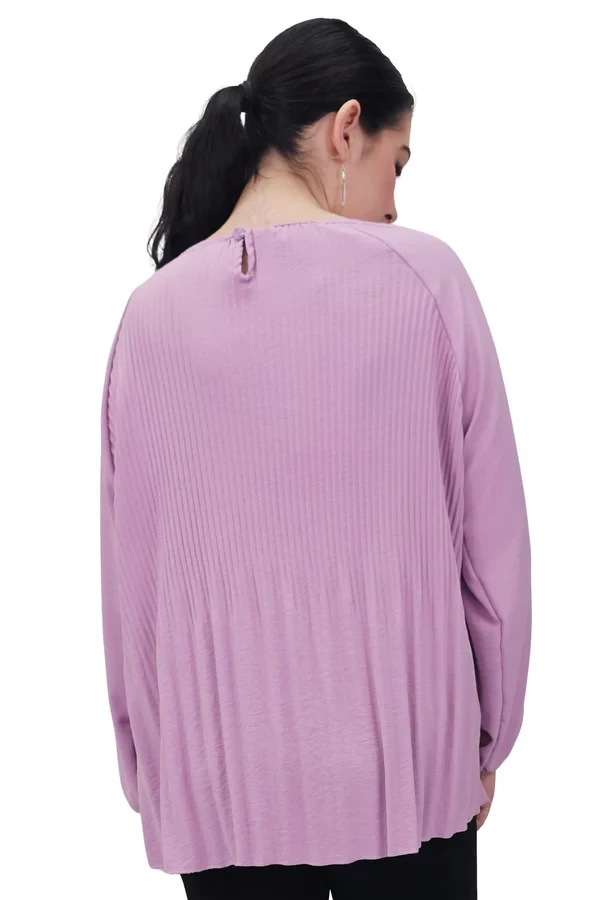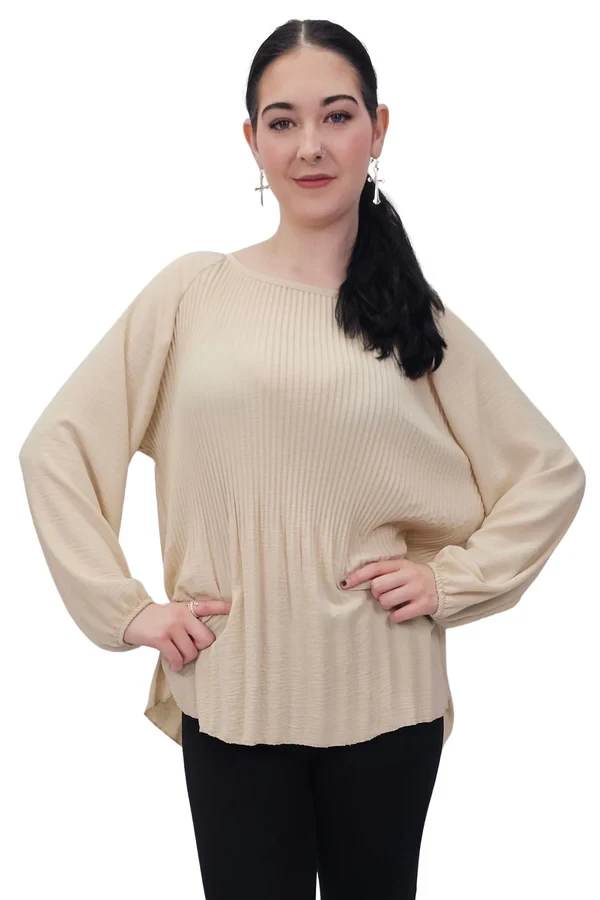 Upgrade your casual wardrobe with this effortlessly chic oversized top. Crafted from soft, breathable viscose, this plus-size top is designed for a loose, relaxed fit — perfect for spring and summer days. It features a classic round neckline and long sleeves with pleated elastic cuffs, adding a subtle touch of texture. The back keyhole button fastening adds a delicate detail, combining style and comfort. Inspired by Italian fashion, this versatile top pairs beautifully with jeans, wide-leg trousers, or skirts for a laid-back yet polished look. Whether you're heading out for brunch or enjoying a casual day out, this top brings effortless elegance to every outfit.