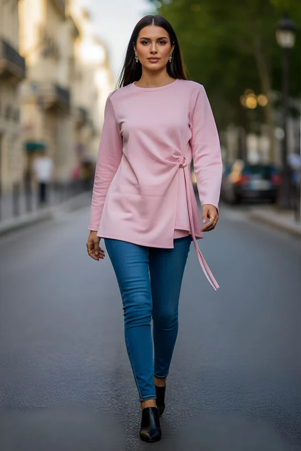 This stylish women top is crafted from premium Italian viscose, offering a lightweight, soft, and comfortable knit feel that perfect for everyday wear. Designed with a classic crew neckline and long sleeves, it delivers a clean and versatile look that suits multiple occasions. The relaxed, loose fit flatters plus-size silhouettes while allowing easy movement and all-day comfort. A standout side tie detail with a metal ring accent creates a subtle ruched effect on one side, adding a modern and fashion-forward touch. Finished with an asymmetric hemline, this top brings effortless style without compromising comfort. Ideal for spring and autumn, it also works beautifully as a layering piece during winter months. Whether paired with jeans for casual wear, styled for outings, or worn while travelling, this top is a versatile wardrobe essential designed for comfort, elegance, and everyday confidence.
