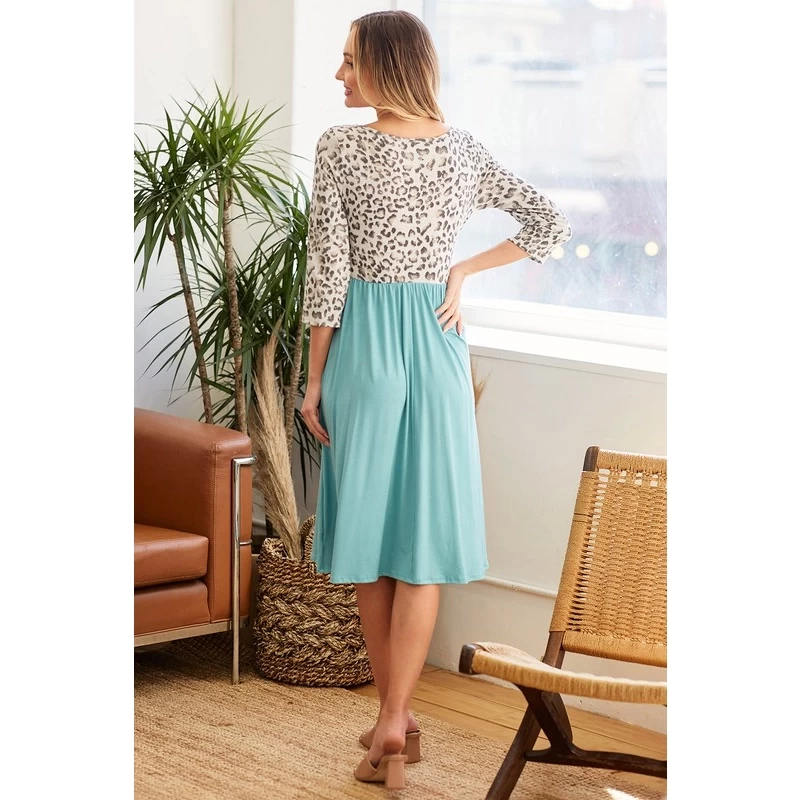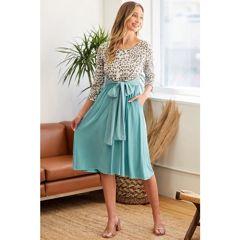 2 FER MIDI DRESS WITH LEOPARD TOP AND SOLID RAYON JERSEY SKIRT AND SELF SASH Model/Picture information Height: 5\\'8 US Size: 2 Bust: 33\\" Waist: 25\\" ** Model wears a size small** *** ALL accessories are not included*** *MEXICO / USA PRODUCTION*