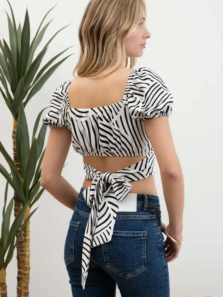 SCOOP NECKLINE SHORT PUFF SLEEVES ELASTIC SLEEVE CUFF ELASTIC BACK BACK SELF TIE CROP TOP GEOMETRIC PRINT NOT LINED 100% POLYESTER