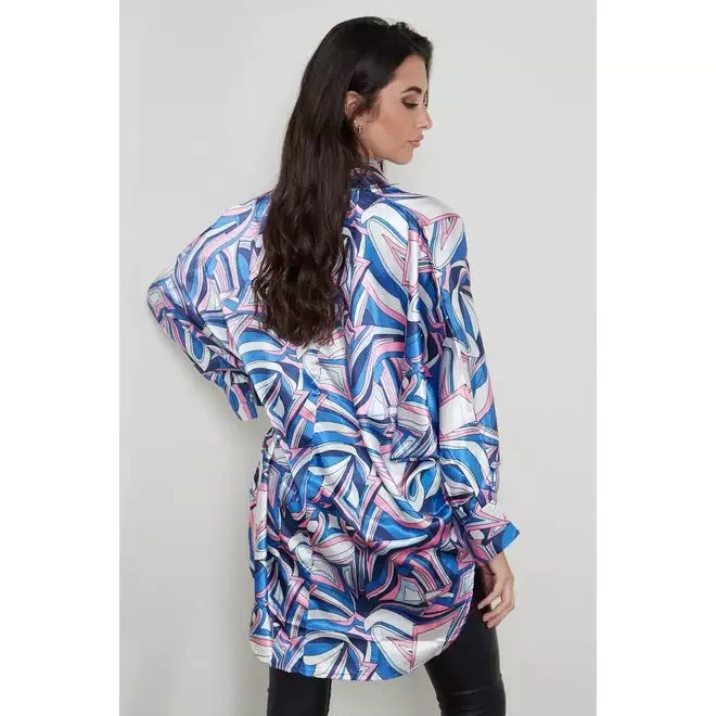 PRINTED OVERSIZED DIP HEM SATIN SHIRT DRESS
