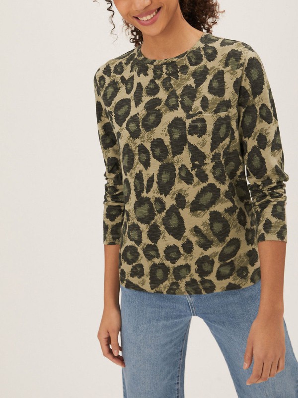 This animal print top is made from pure cotton with a cosy slub texture. Cut to a comfortable straight fit with a classic crew neckline. A front patch pocket makes for a casual finish. Length 26in/66cm.