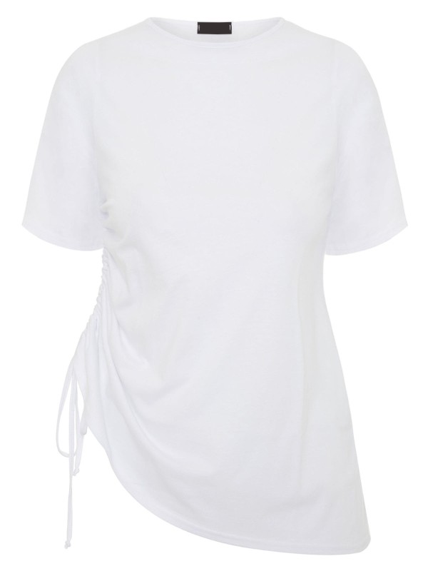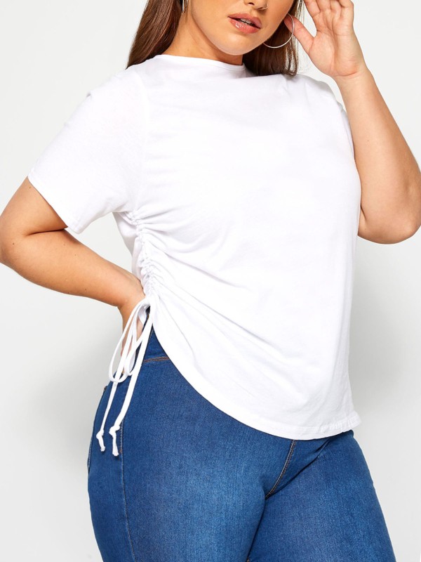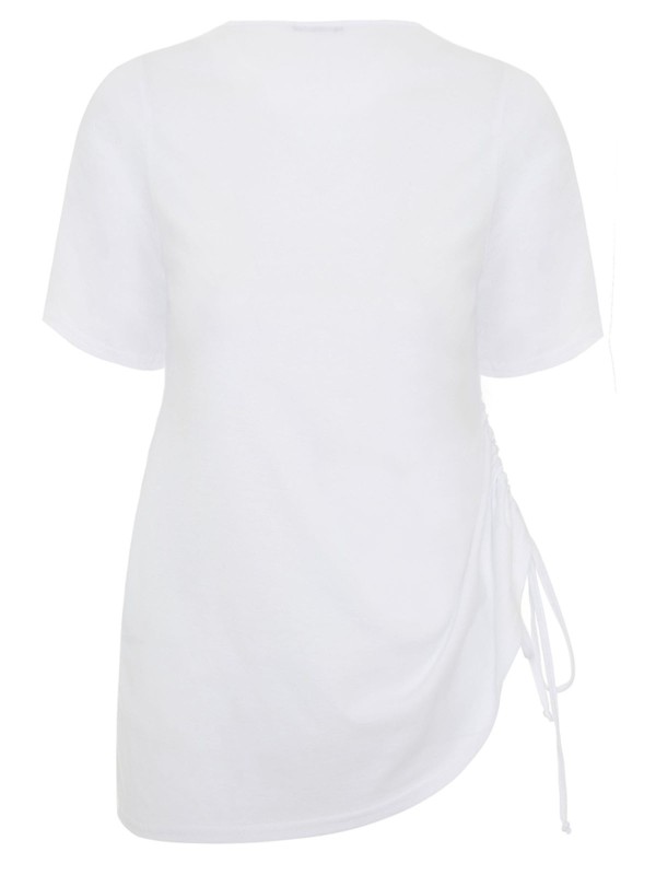 This cotton top is here for all your styling needs. Featuring a round neck, short sleeves and functional drawstring at the side. Length 28in.