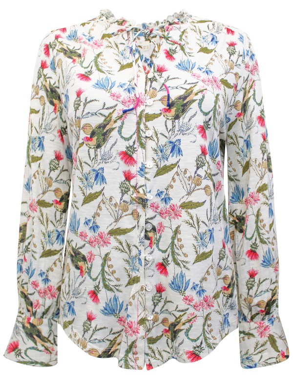 Made in a comfortable cotton fabric, it features a tie neck, long sleeves, and frill detail. Length 25in.