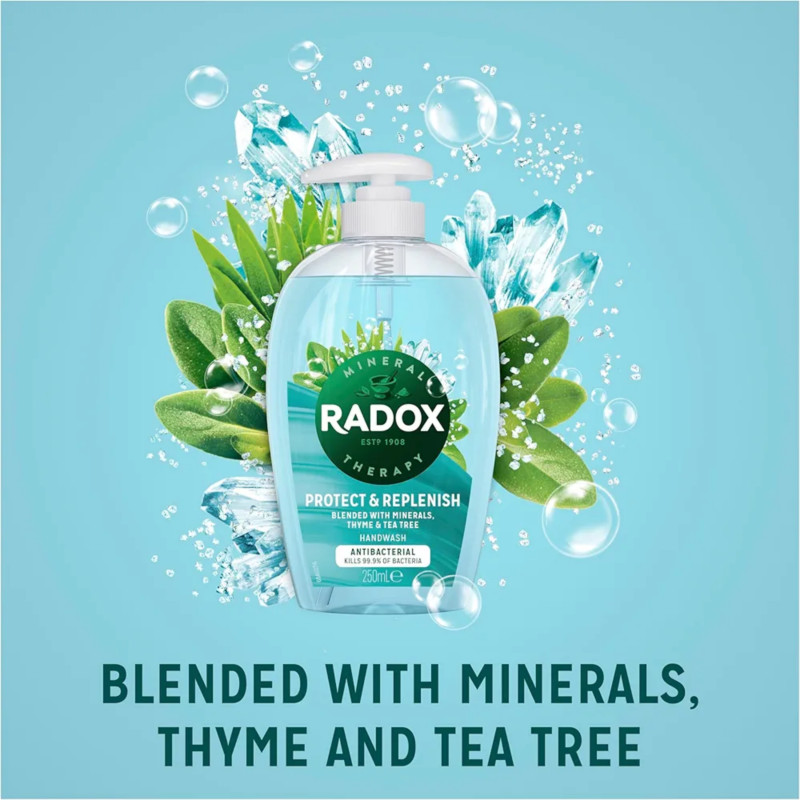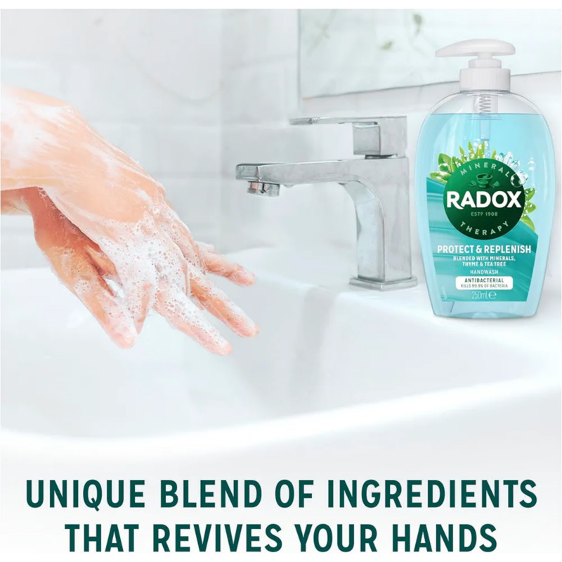 Radox Protect and Replenish Antibacterial Hand Wash Thyme and Tea Tree 250ml delivers dependable germ-fighting protection while caring for your skin with a refreshing herbal cleanse. Its antibacterial formula helps eliminate harmful bacteria with every wash, keeping hands clean, hygienic, and revitalised. Enriched with thyme and tea tree extracts, it offers natural purifying benefits and a crisp, invigorating scent that awakens the senses. The rich, creamy lather spreads easily and rinses off smoothly without leaving residue or drying out the skin. Designed for everyday use, it helps maintain soft, comfortable hands even with frequent washing. Suitable for all skin types, including sensitive skin, for gentle yet effective cleansing. The 250ml size is ideal for bathrooms, kitchens, or shared sinks in homes and workplaces. Easy-to-use pump dispenser ensures quick, mess-free application every time. Helps support good hand hygiene habits for the whole family. Dermatologically tested for skin friendliness and reliable performance. Leaves hands feeling refreshed, replenished, and lightly scented. Perfect for use after errands, meals, or outdoor activities. Combines antibacterial strength with natural herbal care in every wash. Radox Protect and Replenish Hand Wash keeps hands clean, cared for, and beautifully fragranced with every use.
