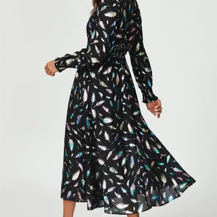 Elevate your evening look with the Metallic Feather Foil Long Sleeve Maxi Dress in Black. This elegant maxi dress features a striking metallic feather foil design that glistens against the deep black fabric, creating an eye-catching, luxurious feel. The long sleeves add a touch of sophistication, while the flowing silhouette provides effortless elegance. Perfect for formal events or special occasions, this dress ensures you stand out with its blend of bold glamour and timeless charm.