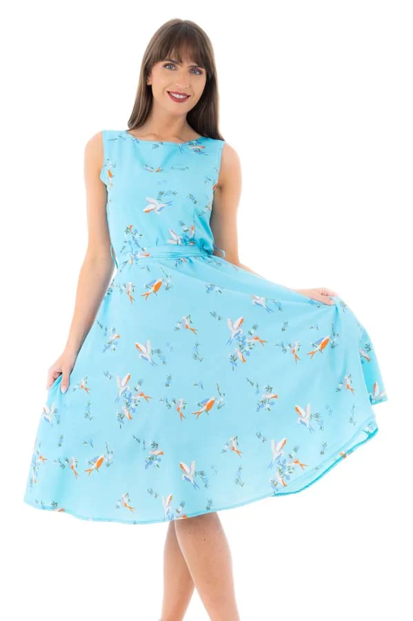 Check out this stunning bird print midi dress in a retro vintage inspired 1940's style. A vibrant bird print this a must have for all year round