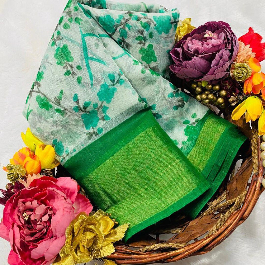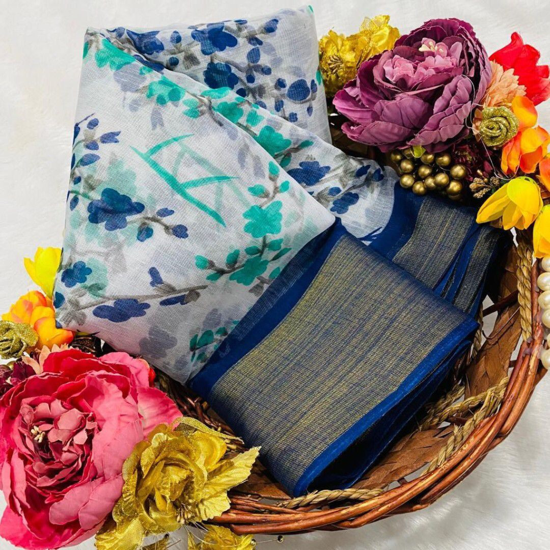 SAREE - SOFT COTTON SLUB [ zari weaving border and beautiful HD flower print ] BLOUSE - SOFT COTTON SLUB [ running contrast printed blouse ]