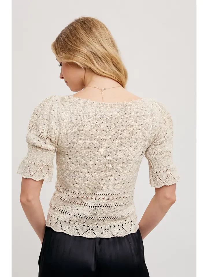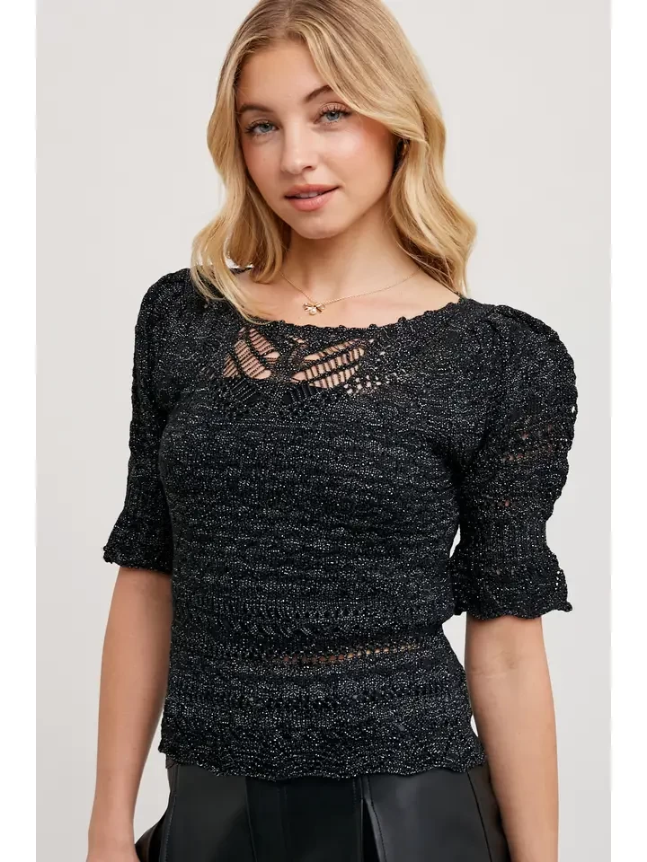 The sheer crochet top with short sleeves is a delightful and feminine piece that exudes a bohemian and airy charm. Crafted from a delicate crochet fabric, this top offers a subtle glimpse of skin while maintaining a stylish and modest appearance. The short sleeves provide a comfortable and breezy feel, making it ideal for warm weather or layering with other pieces. The intricate crochet detailing adds a touch of texture and visual interest to the top. Whether paired with high-waisted shorts, jeans, or a skirt, this sheer crochet top is perfect for creating a chic and romantic look that effortlessly transitions from day to night. -Model is 5'9" and wearing a Small