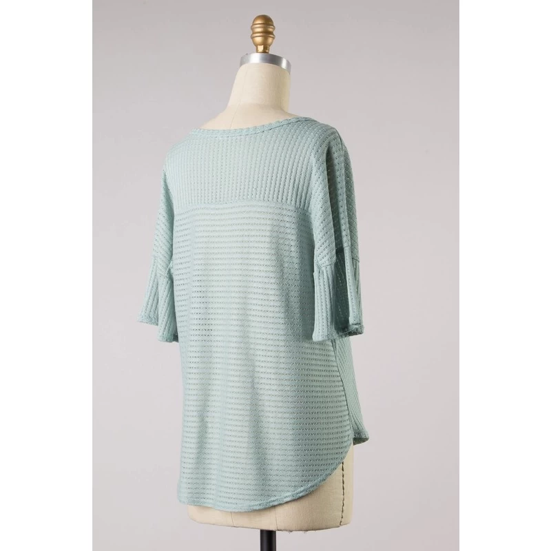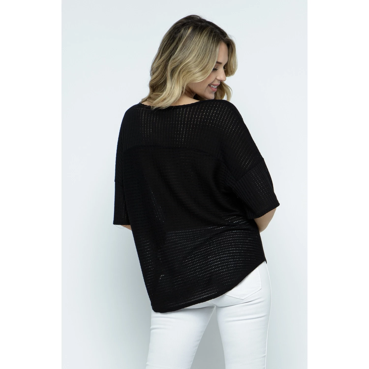 SOLID CASUAL COMFY WAFFLE V-NECK TOP - Model is 5'9'' 32"-24"-35" and wearing a small