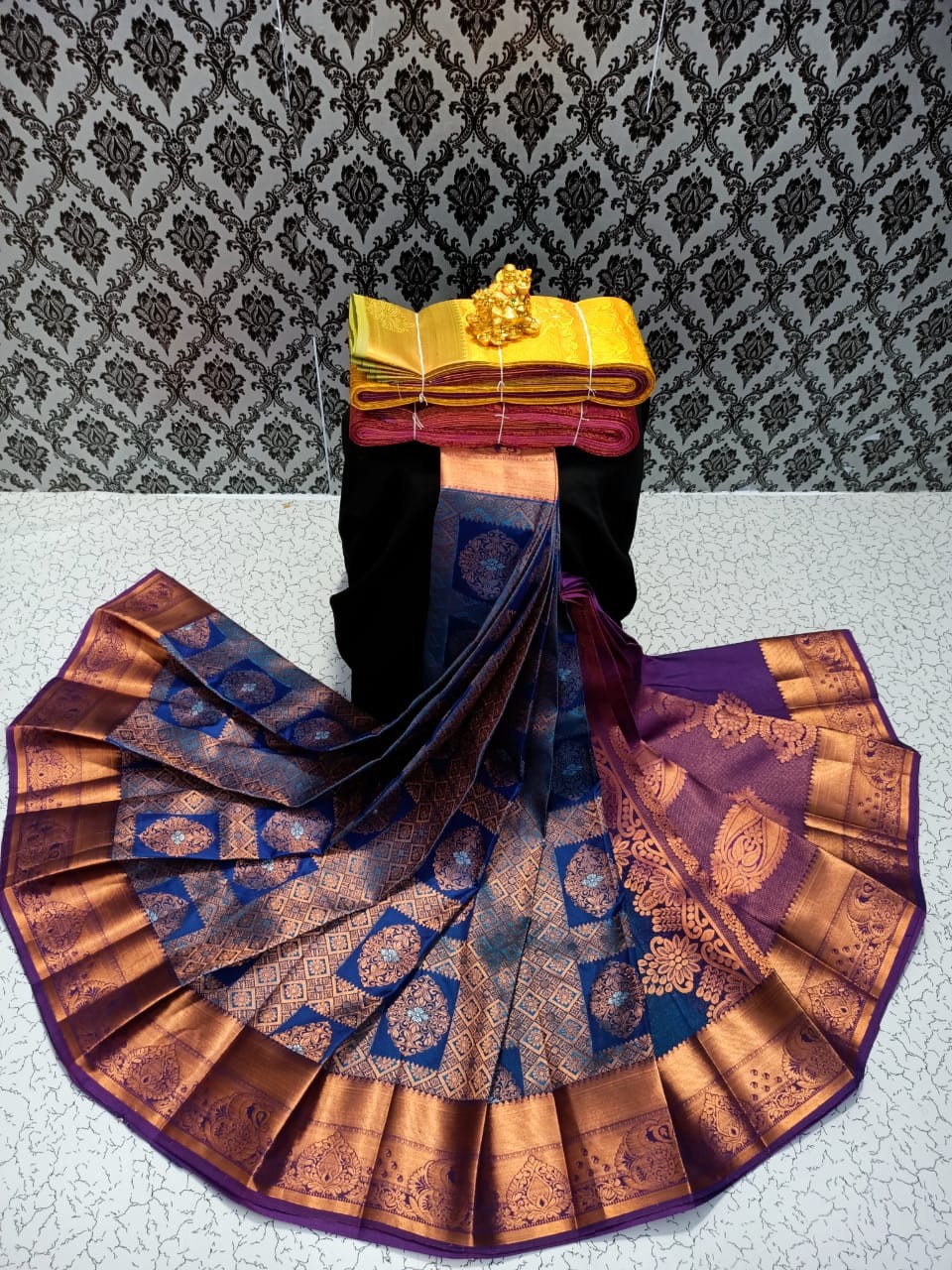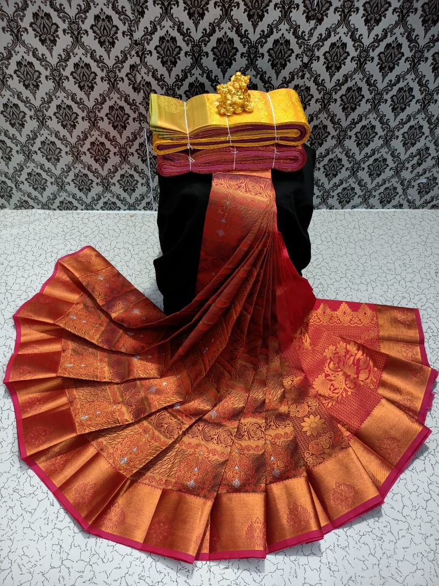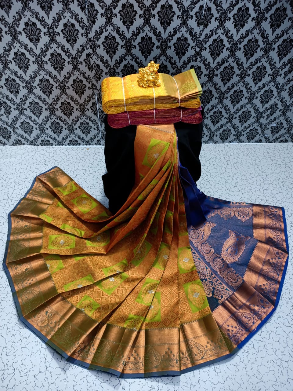 Fancy meena design full brocket. Body all over grand colour full Copper Jari designs & also vibrant colours. Pure silk design pallu &blouse.