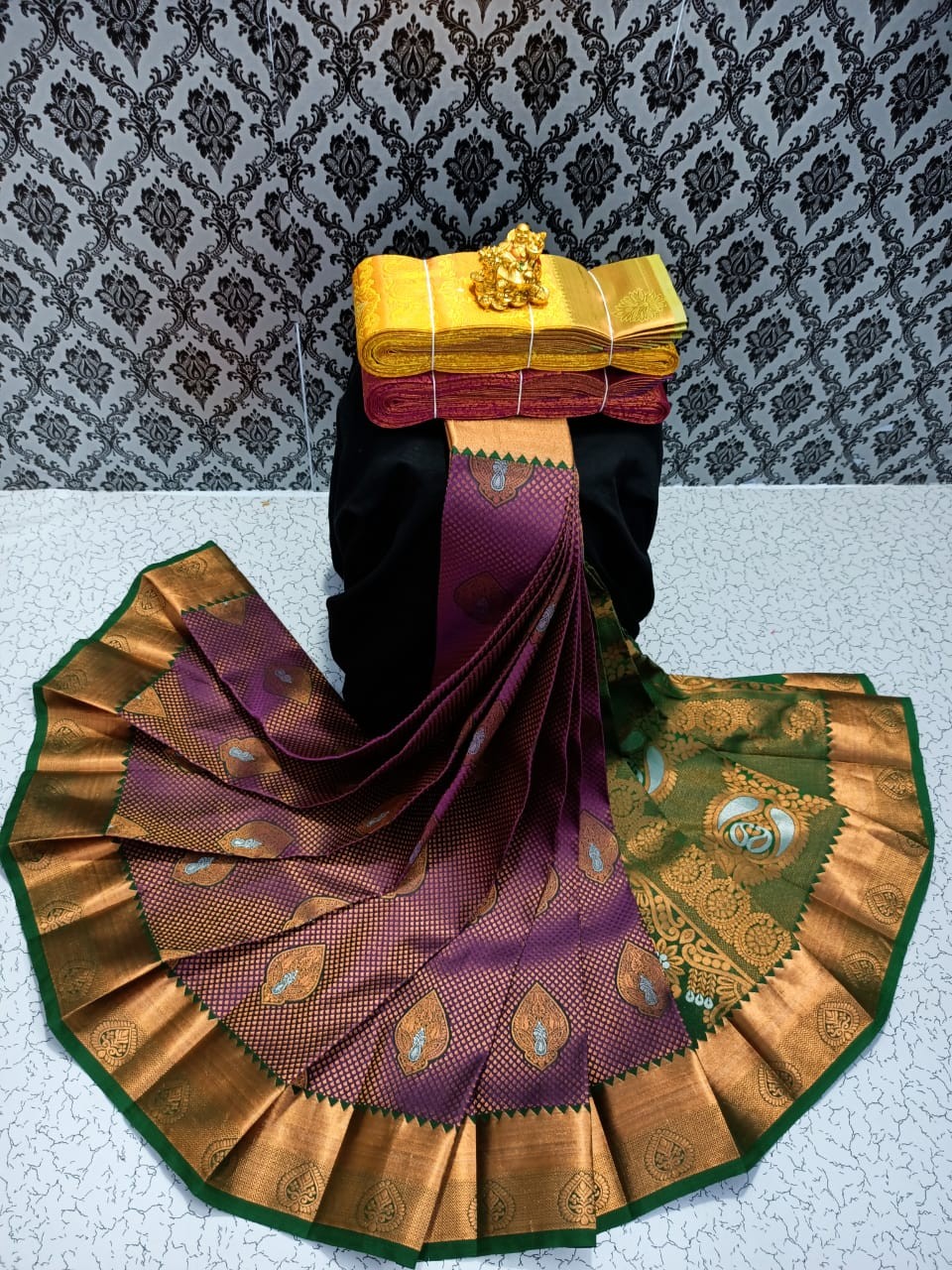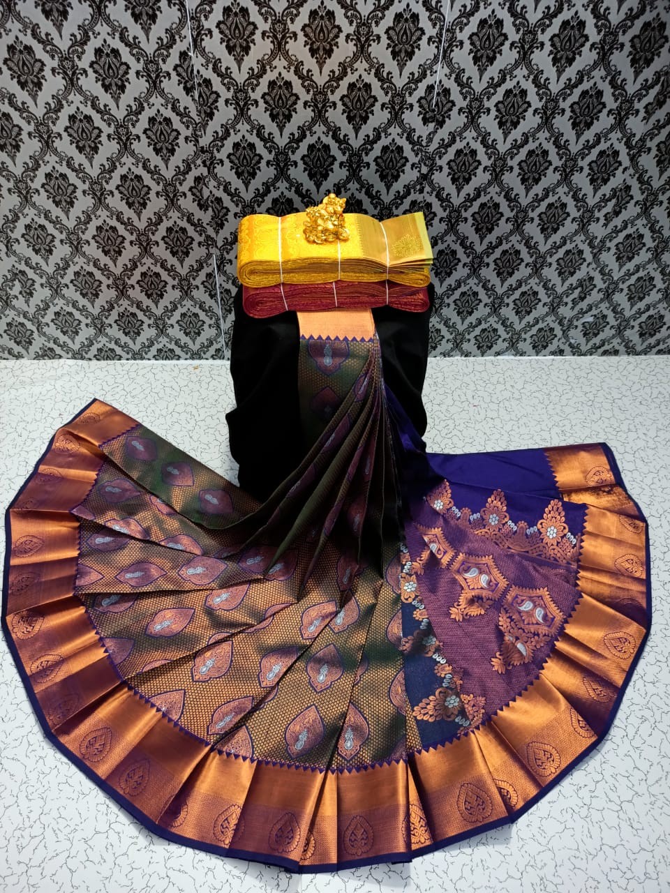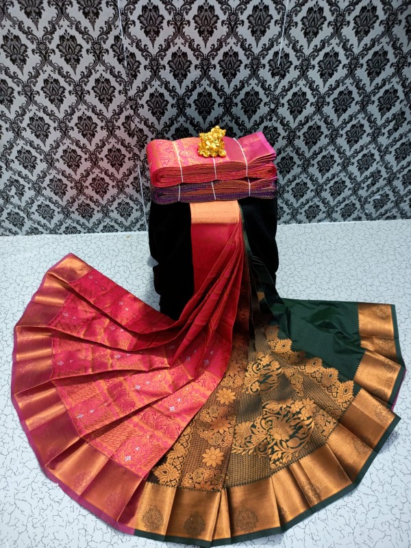 Fancy meena design full brocket. Body all over grand colour full Copper Jari designs & also vibrant colours. Pure silk design pallu &blouse.