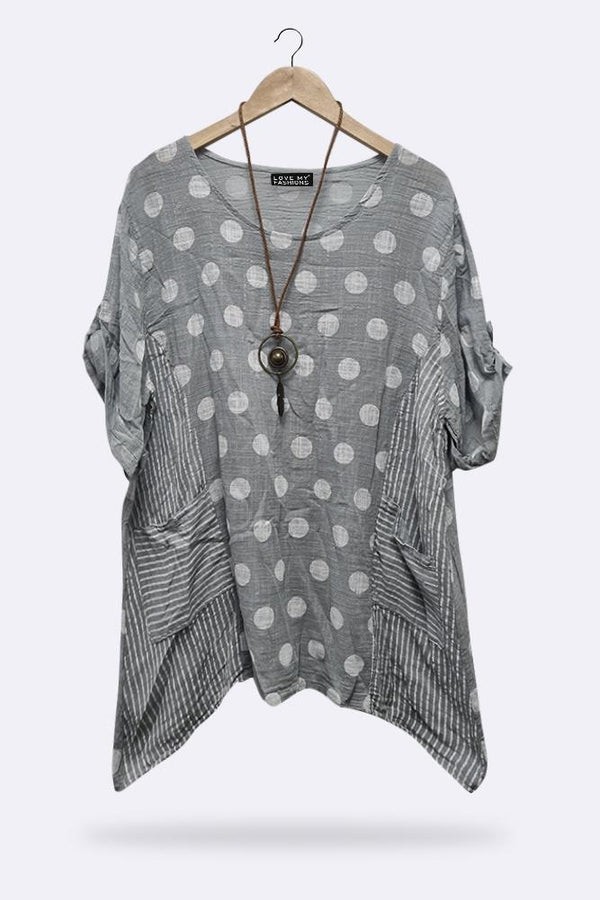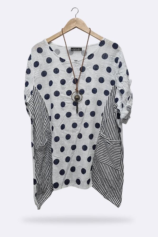 Made in loveable material these are a must for any store this season. Features Cotton material-Stripe & Dot Print-Necklace Pockets-Short Sleeve-Round Neck-One Size Fits Perfectly-Italian Top.