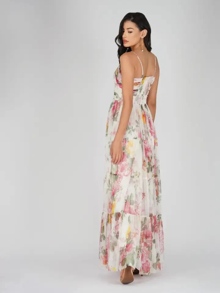 Lace & Beads Thea ivory floral printed maxi dress. This floral maxi dress is the ultimate choice for a gorgeous look at any event. Perfect for those seeking a garden party dress, a standout wedding guest dress, or a summer dress.