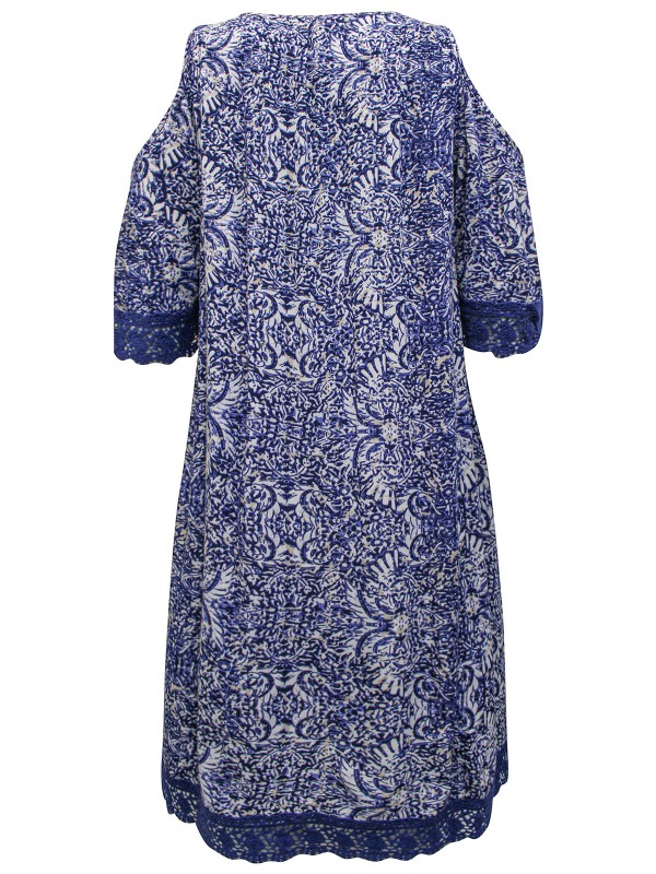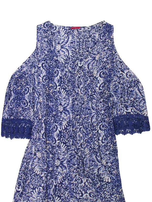 Porcelain prints are a must-have for the summer season! This printed cold shoulder dress features cold shoulders with short sleeves and lace trims. Length 36in.
