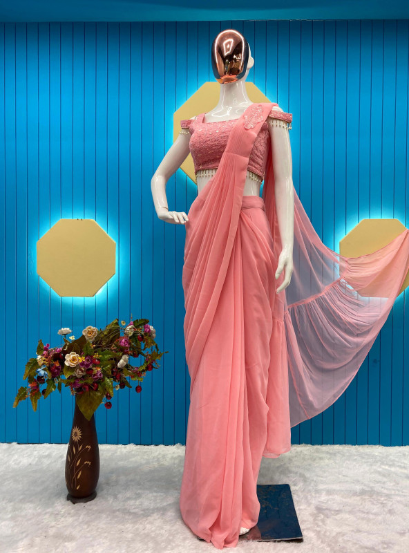 TRENDING STYLE NEW FANCY READY TO WEAR FAUX GEORGETTE SEQUENCE PATCH WORK SAREE AND FULLSTITCHED BLOUSE