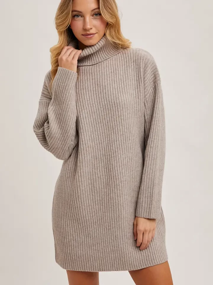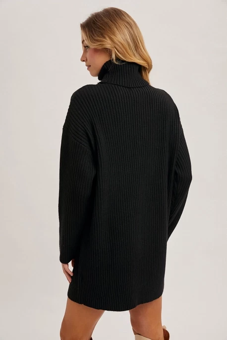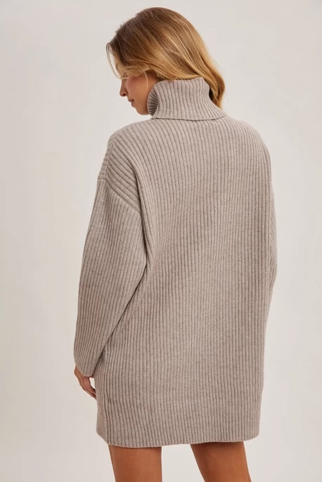 The turtleneck knit sweater dress is a chic and cozy wardrobe staple. With its high neckline, it provides warmth and a sleek, elongated silhouette. The soft knit fabric ensures comfort, while the dress's relaxed fit offers versatility for layering or wearing alone. Whether paired with boots for a casual day out or dressed up with accessories for a night out, this sweater dress combines style and practicality, making it perfect for cooler seasons.