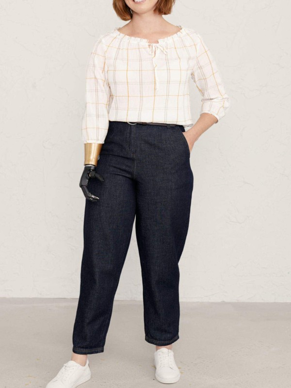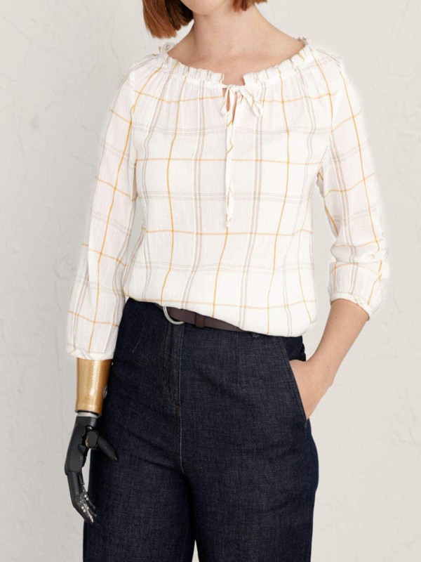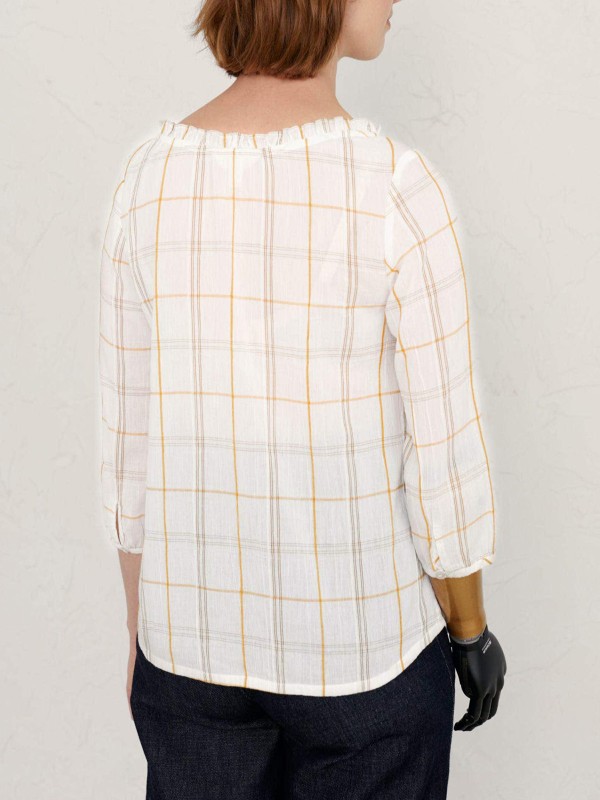 A top for easy days, in breezy cotton with gathered sleeves and a playful, feminine frill and tie detail on its wide boat neck. The checks are yarn-dyed for vibrancy and longevity. Length 24in.