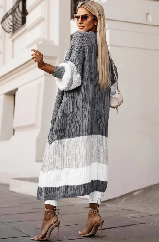 ZAMEKA LONGLINE KNITTED COLOUR BLOCK OPEN CARDIGAN-GREY